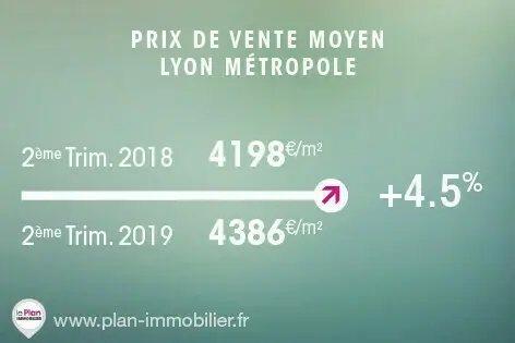 Sur le territoire de la Métropole de Lyon, le prix moyen du mètre carré est de 4 386 € au 2e trimestre 2019, soit une hausse de +4,5% par rapport au 2e trimestre 2018.