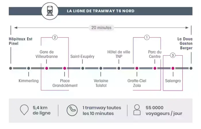 2026 marquera également l’arrivée de la ligne de Tramway T6 prolongée depuis les Hôpitaux Est vers la Doua, et amenée à traverser tout le quartier des Gratte-Ciel.
